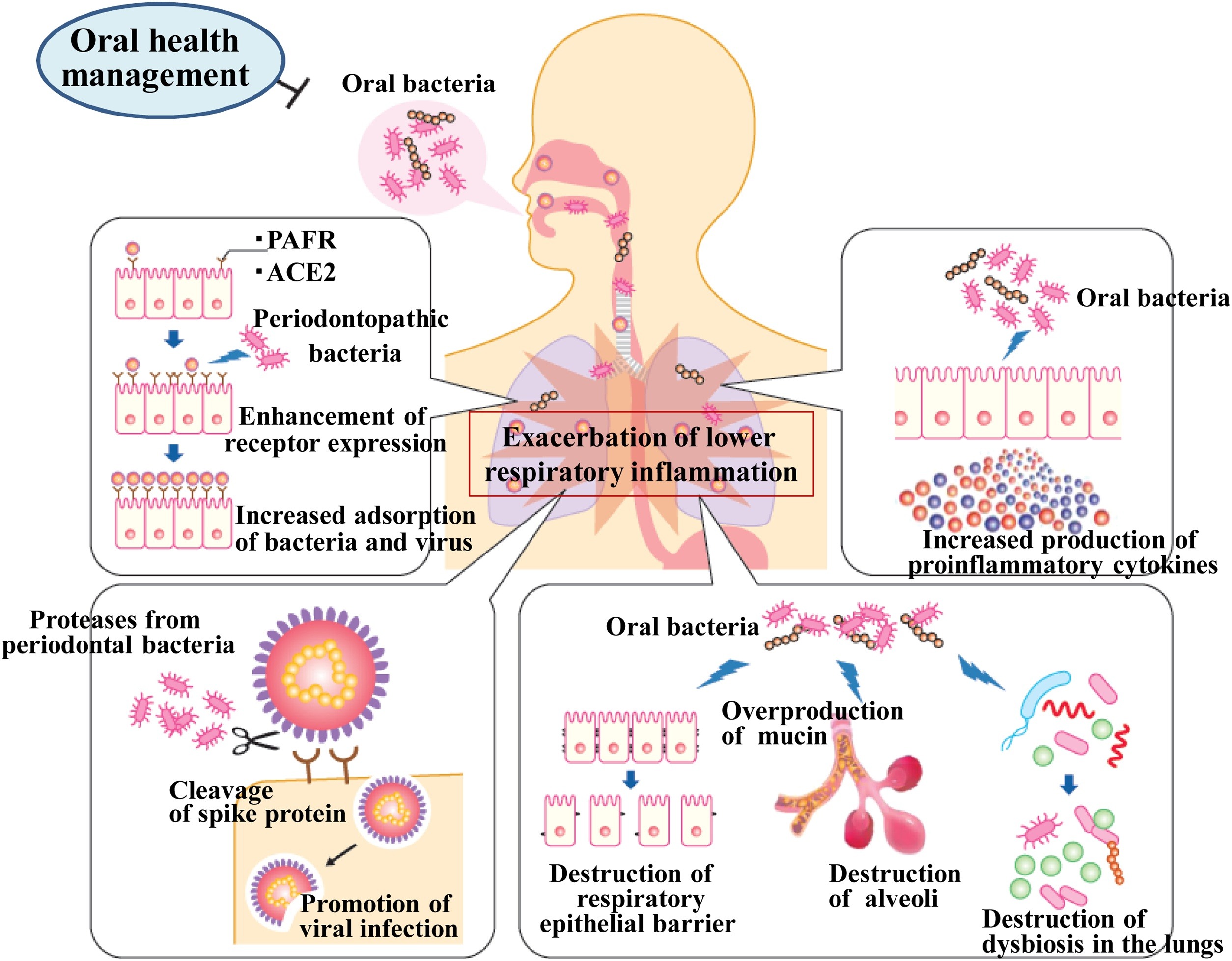 The global population is aging, and elderly people have a higher incidence of lower airway diseases owing to decline in swallowing function, airway ciliary motility, and overall immunity associated with aging. Furthermore, lower airway diseases in the elderly tend to have a high mortality rate. Their prevention is important for extending healthy life expectancy and improving the quality of life of each individual. In recent years, the relationship between “chronic periodontitis and oral bacteria, especially the periodontopathic ones” and “respiratory diseases” (e.g., pneumonia, chronic obstructive pulmonary disease, and influenza) has become clear. In addition, the association of several periodontal pathogens with the onset and aggravation of coronavirus disease 2019 (COVID-19) is also being reported. In support of these findings, oral health management has shown to reduce deaths from pneumonia and prevent influenza in nursing homes and inpatient wards. This has led to clinical and multidisciplinary cooperation between physicians and dentists, among others. However, to date, the mechanisms by which “chronic periodontitis and oral bacteria” contribute to lower airway diseases have not been well understood. Clarifying these mechanisms will lead to a theoretical basis for answering the question, “Why is oral health management effective in preventing lower airway diseases?”
