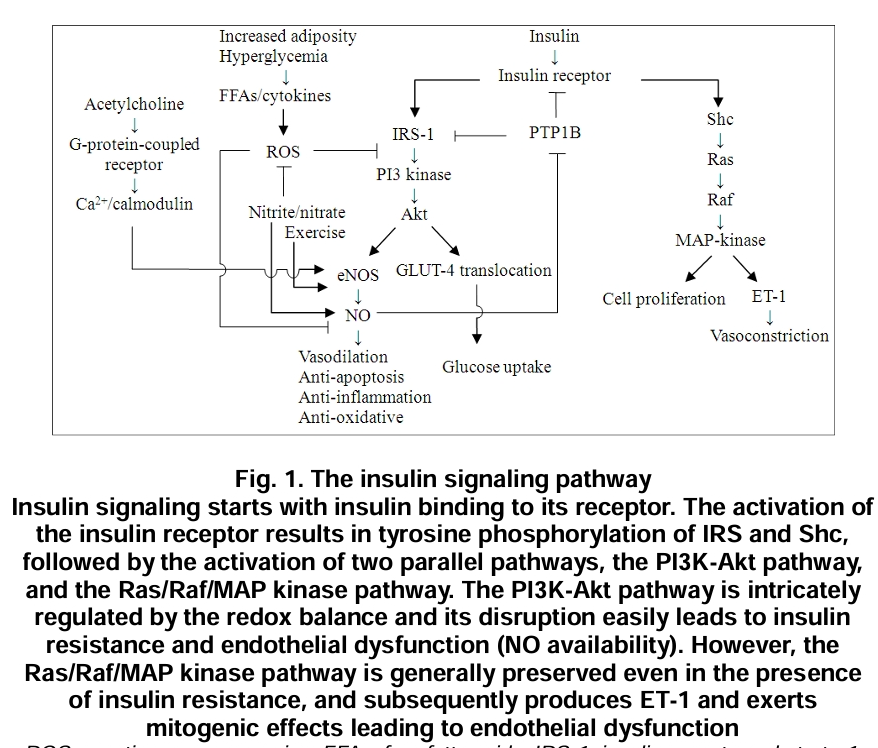 The aim of this review are to discusses the mechanisms by which insulin resistance develops in the presence of increased adiposity, to summarize the causative relationship between impaired NO bioavailability and insulin resistance, and also to show the implications of life-style changes to prevent insulin resistance. Obesity with increased visceral adiposity is an inflammatory condition that leads to insulin resistance. Because the insulin signalling pathway is linked to endothelial nitric oxide synthase (eNOS) activation, insulin resistance is always associated with decreased nitric oxide (NO) bioavailability. Recently, accumulating evidence has suggested that physical exercise and dietary nitrate/nitrite diets rich in vegetables improve insulin resistance by enhancing NO bioavailability, and thus provide potential preventive and therapeutic options for these patients with insulin resistance. Added by: Dr. Enrique Feoli |
