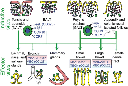 Putative scheme for compartmentalized mucosal B-cell homing from inductive (top) to effector (bottom) sites in humans. Depicted are more or less preferred pathways (graded arrows) presumably followed by mucosal B cells of any isotype activated in nasopharynx-associated lymphoid tissue (NALT) represented by Waldeyer's lymphoid ring (including palatine tonsils and adenoids), and bronchus-associated lymphoid tissue (BALT), versus gut-associated lymphoid tissue (GALT) represented by Peyer's patches, appendix, and colonic-rectal isolated lymphoid follicles. The principal homing receptor profiles of the respective B-cell populations, and compartmentalized adhesion and chemokine cues directing their extravasation at different effector sites, are indicated (pink and blue panels). The gland-associated distribution of plasma cells (green), after terminal differentiation of extravasated mucosal B cells, is schematically depicted at the bottom.