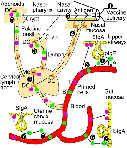 Resumed immunobiology underlying induction of T (violet) and B (green) cells after nasal vaccine administration, and local generation of secretory IgA (SIgA) antibodies by export via the polymeric Ig receptor (pIgR). 1 = delivery device for nasal vaccine administration (nasal spray, drops, or OptiMist); 2 = adjuvanted uptake of vaccine antigen through nasal mucosa; 3 = immune-induction in adenoids and palatine tonsils (human NALT); 4 = antigen targeting and migration of mucosal dendritic cells (DCs); 5 = immune induction and amplification in regional (cervical) lymph nodes by antigen-loaded DCs and macrophages (Mφs); 6 = compartmentalized homing and extravasation of NALT-induced T and B cells to secretory effector sites in airways, gut, and uterine cervix; and 7 = local production and pIgR-mediated external transport of dimeric IgA to generate SIgA. As discussed in the text, NALT-derived B cells preferentially extravasate at regional effector sites and in systemic lymphoid organs, while showing only poor homing capacity for the small intestinal lamina propria Added by: Dr. Enrique Feoli Last edited by: Dr. Enrique Feoli |