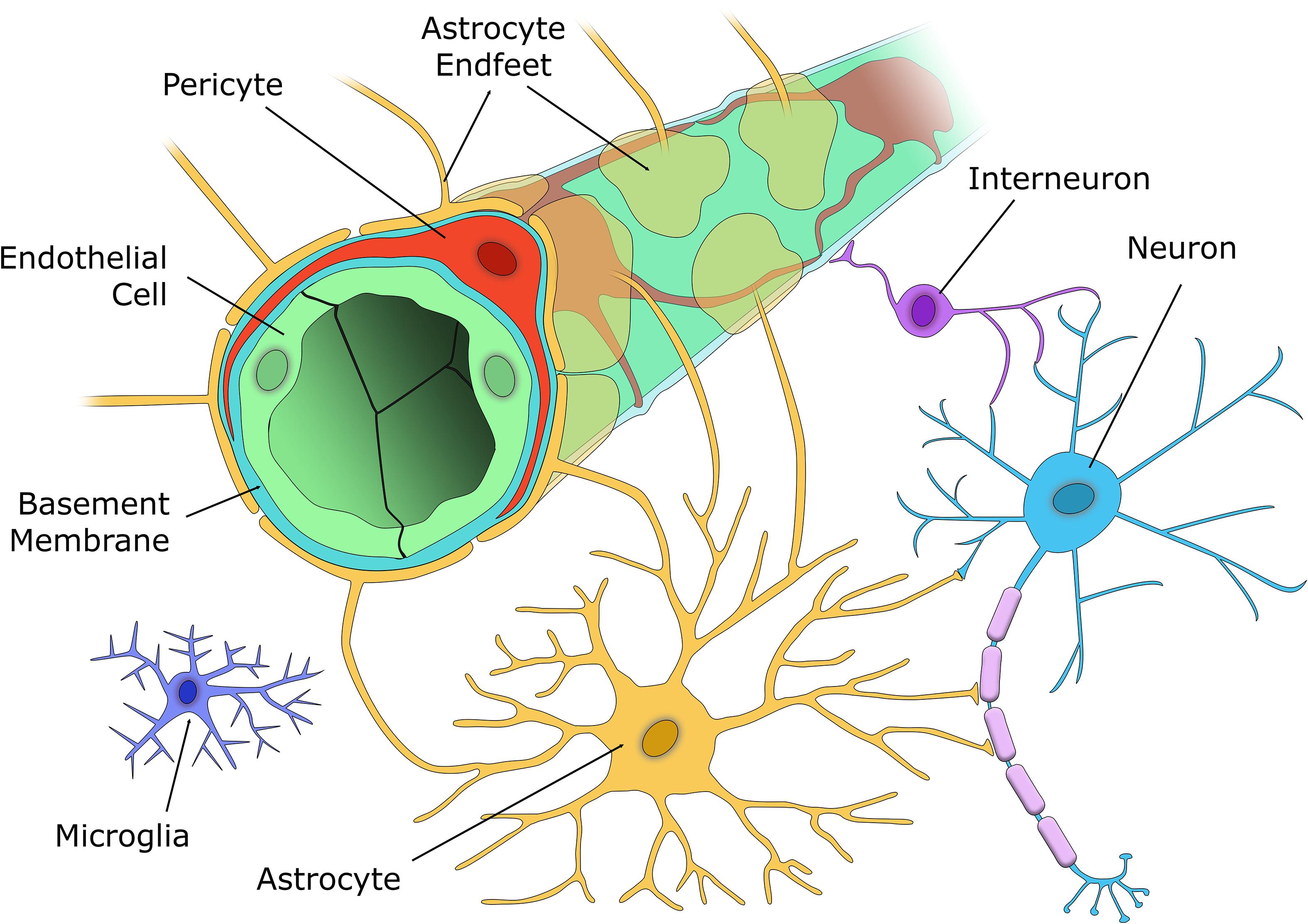 The cellular components of the NVU. The capillary wall contains a single EC layer (green) connected by tight junctions that form the blood-brain barrier along with pericytes (red), that are embedded within the capillary basement membrane (light blue), and nearby astrocyte endfeet (yellow). Excitatory neurons (blue) synapse with both vasoactive interneurons (purple), and astrocytes (yellow), who in turn signal to the capillary to alter blood flow according to the metabolic demands of that brain region. Microglia (indigo) are located in the brain parenchyma and respond to any aversive stimuli to protect the brain. Added by: Dr. Enrique Feoli Last edited by: Dr. Enrique Feoli |